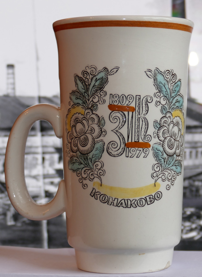 Юбилейная кружка, выпущенная в 1979 году к 170-летию Конаковского фаянсового завода (торговая марка ЗиК — Завод им.Калинина), до революции более известного как Кузнецовский фаянсовый завод. Выполнена из фаянса методом заливки в гипсовые формы, раскрашена глазурью. Высота кружки 13,5 см. Автор работы — главный художник ЗиК, выпускник Ленинградского высшего художественно-промышленного училища имени В.И. Мухиной, член правления Союза художников СССР Николай Алексеевич Коковихин. Кружка оригинальная, на дне имеется фирменное клеймо ЗиК. Состояние артефакта хорошее. С одной стороны на кружке изображено историческое здание завода и надпись «Конаковскому ордена Трудового Красного Знамени фаянсовому заводу им М.И. Калинина 170 лет». С другой стороны нанесен цветочный орнамент, стилизованная аббревиатура ЗиК и даты работы предприятия 1809-1979.