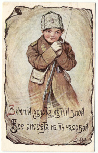 Комплект из 14 дореволюционных цветных почтовых открыток «патриотической серии», выпущенных в период Первой Мировой войны 1914-1918 годов. Уникальность карточек заключается в том, что их героями являются… мальчишки, изображающие солдат в их повседневном ратном быту. Автор рисунков — художник дореволюционного Общества Красного креста Александр Лавров. Каждая иллюстрация сопровождается двустишием — шутливой народной поговоркой, либо ее имитацией. На каждом раритете имеется пометка «перепечатка воспрещена». Оборотная сторона 7-ми открыток заполнена посланиями отправителей, написанными дореволюционным шрифтом (поздравления с Пасхой, Рождеством, Днем Ангела и просто на память).