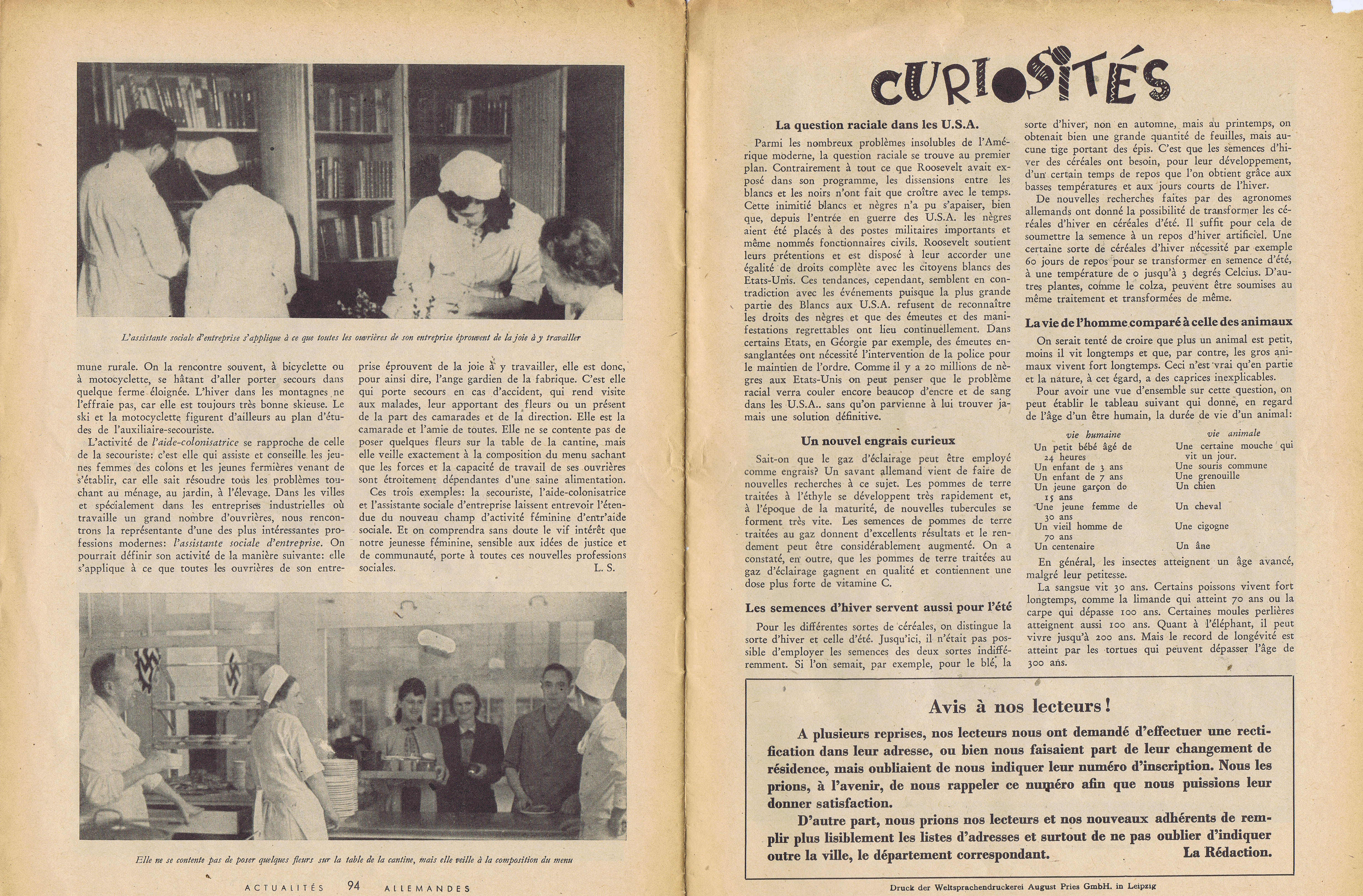 Создается ли впечатление после прочтения «Actualites Allemandes» о том, что в мире в полном разгаре страшная и кровопролитная Вторая мировая война? Стопроцентное нет. Даже военная хроника в начале издания не дает никакого намека на это. Да, корабли тонут. Но сколько людей погибло — неизвестно. Да и какая разница, ведь это люди противника. В Германии-то все хорошо. У нас здесь сельское хозяйство цветет и пахнет, медицина развивается, женщины работают. Главное — не переживайте. Жизнь продолжается, а война далеко. Помните, нашими карандашами фирмы A.W. Faber Castell можно как писать, так и рисовать. Во всем остальном вам поможет медицинское страхование Voltsfurlorge.