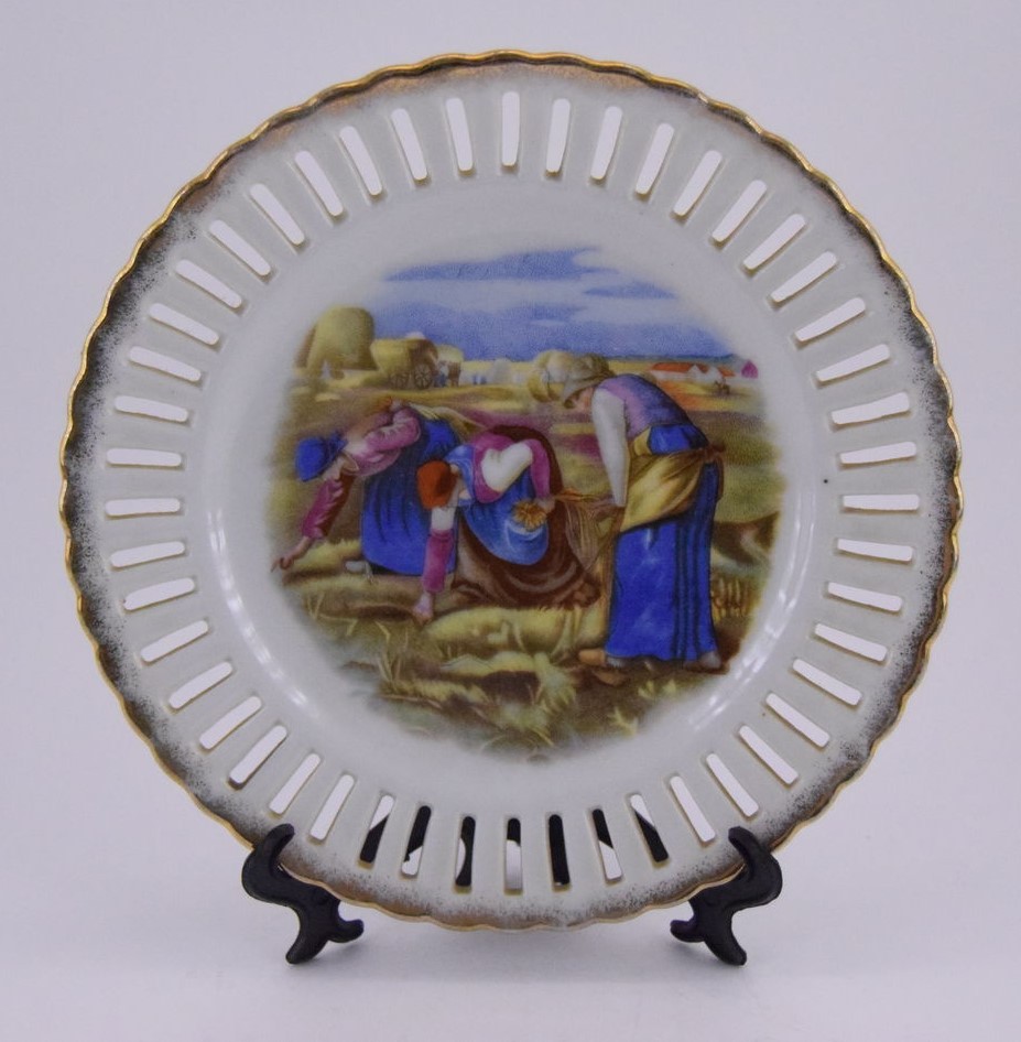 Декоративная настенная тарелка «Жницы». Изготовлена в 1890-е годы мастерами Дулевского фаянсового завода, входящего в «Товарищество М.С.Кузнецова». Диаметр — 19,2 см. Оригинал, состояние удовлетворительное.