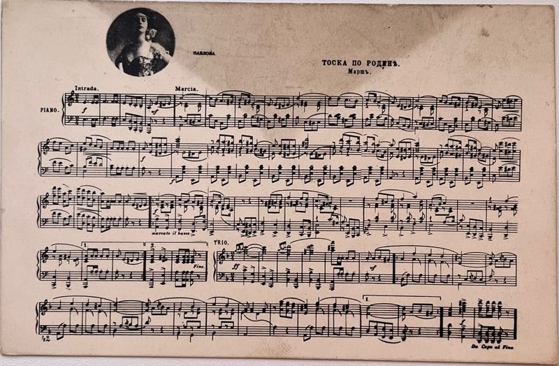 Почтовая карточка с нотами марша «Тоска по Родине», изданная Российским отделением Всемирного почтового Союза на патриотической волне вскоре после начала Первой мировой войны. На лицевой стороне открытки, помимо самих нот, в круглой рамке размещена фотография знаменитой балерины Анны Павловой, при этом автор музыки произведения не указан. Оборотная сторона артефакта не заполнена. Оригинал. Сохранность отличная.