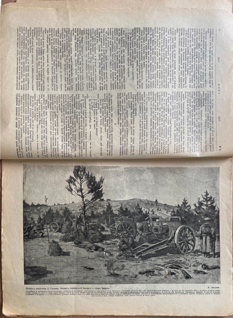 Представленный в нашей коллекции номер «Нивы» — последний из предреволюционных. Через считанные дни начнется Февральская революция, а в 1918-ом, несмотря на Декрет о Свободе печати, издание и вовсе закроют. Номер вышел на фоне затяжной полосы поражений российской армии в Первой мировой войне — отсюда тематика и тональность большинства опубликованных материалов: «Дневник военных действий», повесть Георгия Павлова «Германцы». Журнал не случайно назван иллюстрированным: каждый рассказ в номере сопровождается фотографией или картиной.