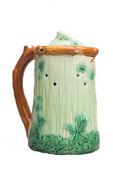 Фарфоровая кружка-шутиха с крышкой. ЗиК, 1952 год. По стенкам сделаны отверстия и надпись «Напейся, но не облейся». Артефакт мог использоваться только в декоративных и сувенирных целях.