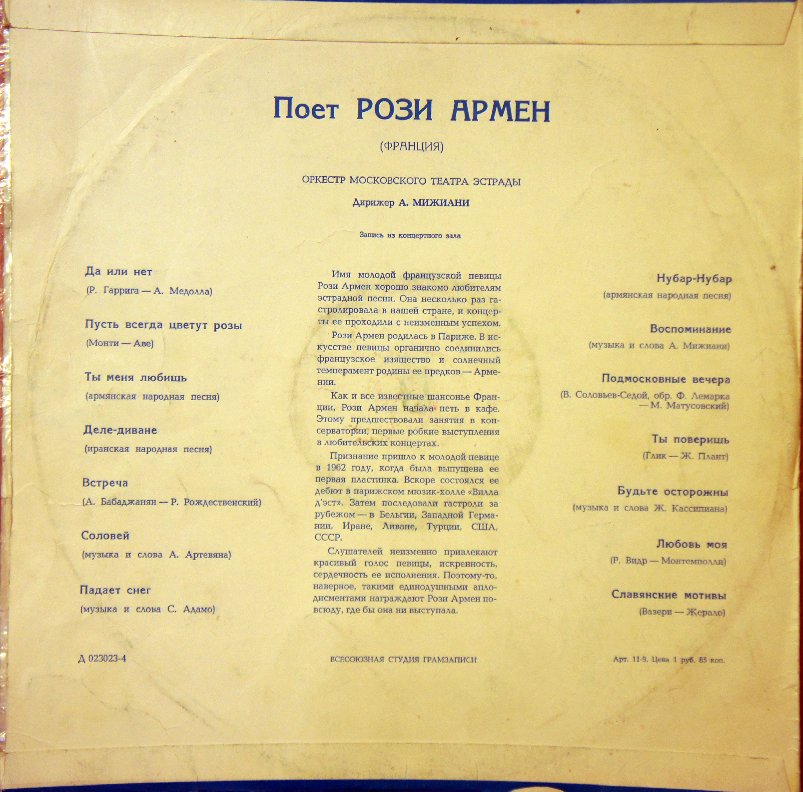 Пластинка с записью московского концерта 1967 года знаменитой французской певицы армянского происхождения Рози Армен. Она родилась в Париже 1 мая 1939 года. Петь Рози Оганесян начала в глубоком детстве; позже, как и все начинающие певицы выступая в парижских кафе, взяла себе сценический псевдоним Армен. К началу 60-х годов Рози Армен — уже известная французская певица, её песни знают и любят не только в Европе, но и в США и даже в СССР. По легенде, кто-то из близких к эстраде советских деятелей услышал Розу по радио и пролоббировал её приглашение в СССР. Первоначально предполагалось, что Рози выступит с 12-ю концертами, однако её успех в СССР было столь ошеломляющим, что в результате певица дала 48 концертов. Представленная в коллекции пластинка была выпущена фирмой «Мелодия»в 1967 году и неоднократно переиздавалась. Что касается Рози Армен, то в 1968 году она переехала жить в Испанию, в 1970 году представляла эту страну на конкурсе Евровидение.