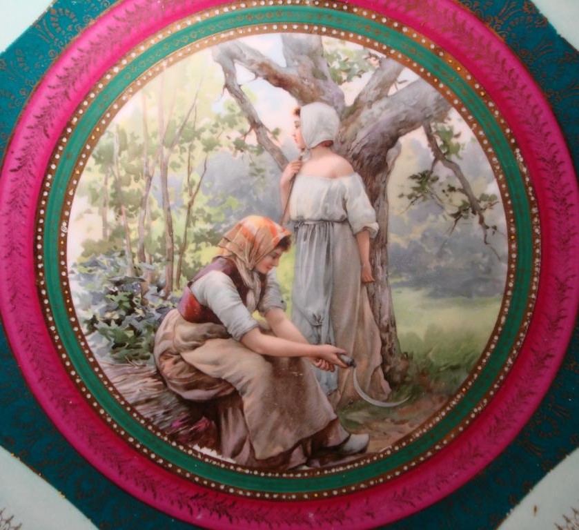 Сюжет «Жницы» — пожалуй, один из самых популярных на столовой и декоративной посуде, изготовленной в конце XIX века на фарфоровых фабриках Кузнецова. В данном случае перед нами тарелка Дулевского фаянсового завода Матвея Сидоровича. Но точно те же две девицы с серпами украсили десятки блюд, супниц и чашек, произведенных, другими предприятиями Товарищества.