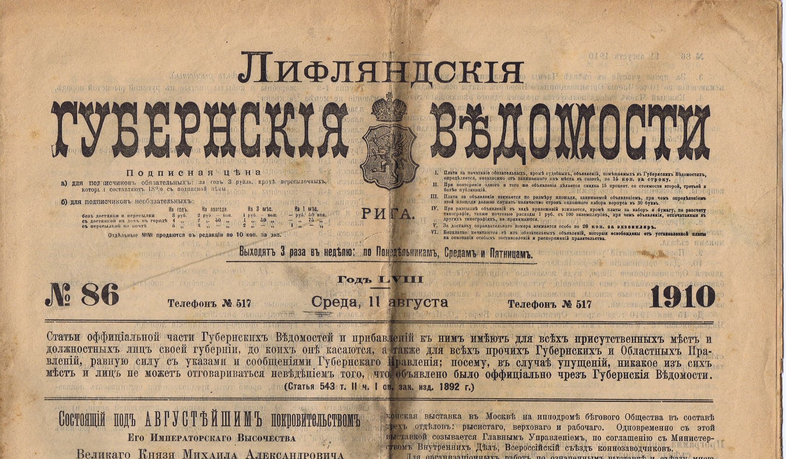 Газета «Лифляндские губернские ведомости» от 11 августа 1910 г. В номере: объявление о сборе пожертвований на постройку в Санкт-Петербурге храма в честь 300-летия дома Романовых, объявление об организации выставки лошадей в Москве, постановление санитарного ведомства о мерах профилактики холеры в губернии. Многочисленные объявления, касающиеся назначений на должности отдельных лиц, наложения взысканий, усыновлений, госзакупок, поиска наследников и т. п.