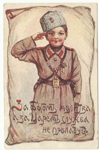 Комплект из 14 дореволюционных цветных почтовых открыток «патриотической серии», выпущенных в период Первой Мировой войны 1914-1918 годов. Уникальность карточек заключается в том, что их героями являются… мальчишки, изображающие солдат в их повседневном ратном быту. Автор рисунков — художник дореволюционного Общества Красного креста Александр Лавров. Каждая иллюстрация сопровождается двустишием — шутливой народной поговоркой, либо ее имитацией. На каждом раритете имеется пометка «перепечатка воспрещена». Оборотная сторона 7-ми открыток заполнена посланиями отправителей, написанными дореволюционным шрифтом (поздравления с Пасхой, Рождеством, Днем Ангела и просто на память).